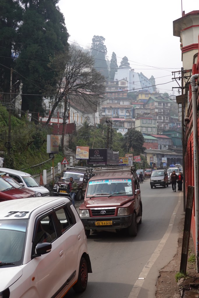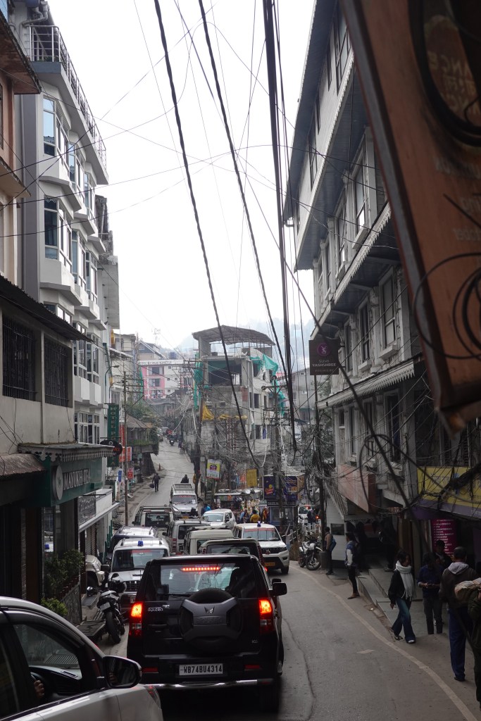 Well we managed to find our way from Kolkata, down in southern Bengal, up to Darjeeling, in the Himalayan foothills to the north. Simple enough – a one hour flight substituted for the early morning train, on which we were booked, after it became a late afternoon train owing to philosophical differences between the Indian National Railway and its timetable. Then a drive that started on some straight flat roads at about 400 feet above sea level until we yanked hard right and our guide said that was it for straightaways and we climbed 6500 feet in 45 kilometers of nonstop hairpins in a little over 2 hours. And then there we were, in a bustling bursting bouillabaisse of a place perched precariously on the spine of a very steep ridge.