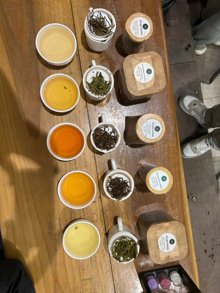 Darjeeling is the home of English tea growing, owing its start to a Brit who smuggled seeds out of China and began cultivating them here in the mid 1800s. And tea is all around. Our guide has patiently schooled us – after pointing out that we were not even at grade one one the subject – about the many stages of getting tea from the plant to the pot. He was born on a tea plantation and has lived in Darjeeling his whole life. We are working hard at it. We are also being schooled on the different kinds and colours and tastes – only of Darjeeling tea of course – and had a tasting that took us through the intricacies of first flush, second flush, oolong and the like.