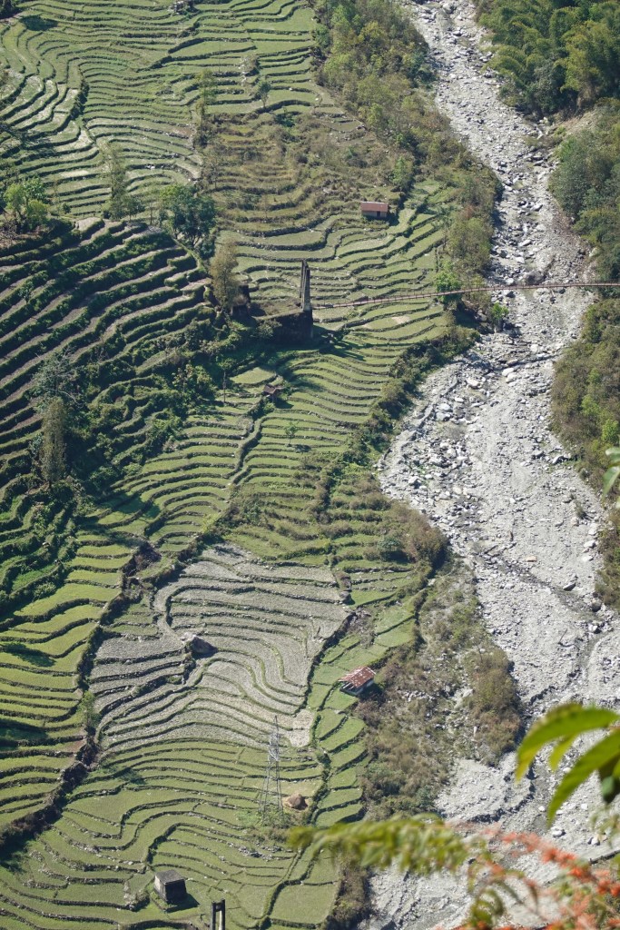 Anyhow, what with all the switchbacks and hairpins and going down one side of a foothill by 1500 meters and around and up the next it takes a while to actually get anywhere. We pulled off for a break and our guide pointed out that we could see the hotel we had left two and a half hours earlier. But there is lots to see. There are beautiful rice terraces, which we saw from the top of a cliff directly overhead. And there is Sikkim’s only tea plantation, swarming with tourists where there were souvenirs to be had but deserted another mile down the road where we stopped.