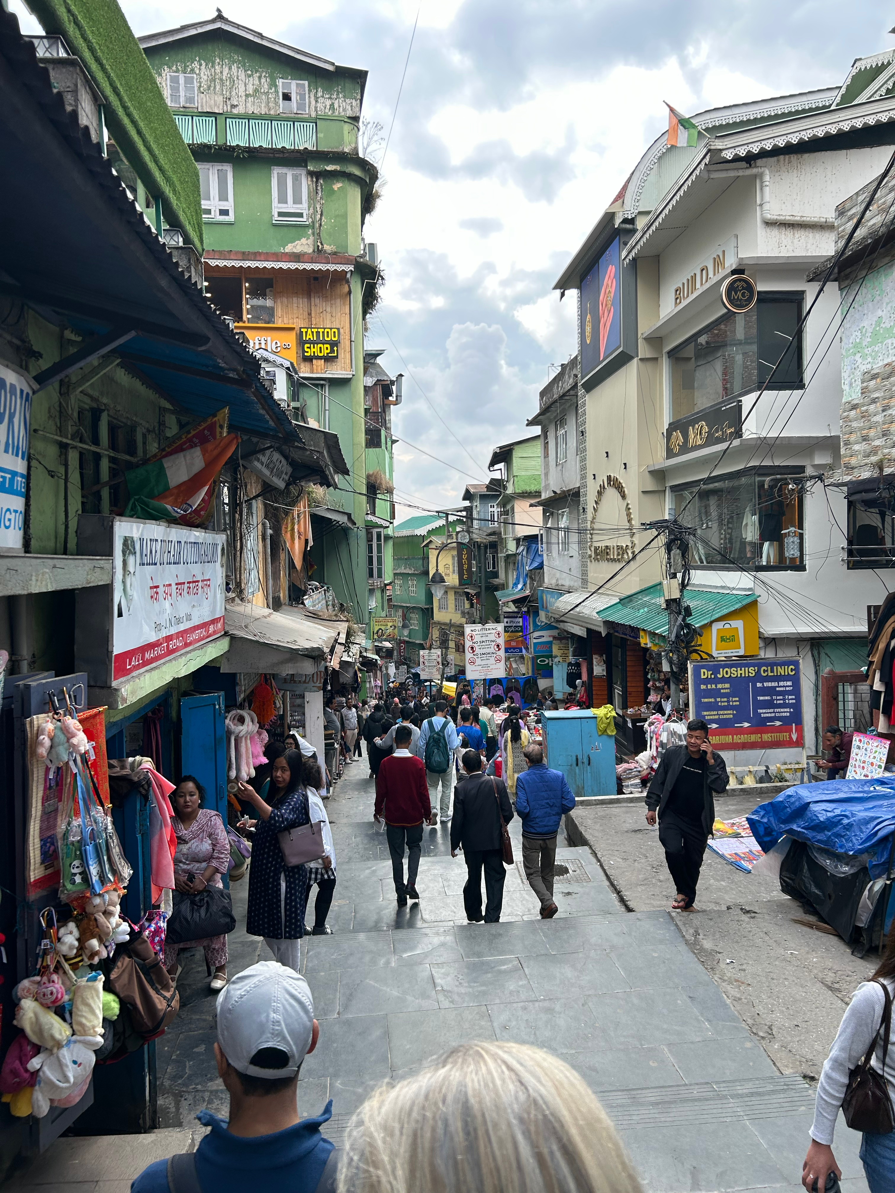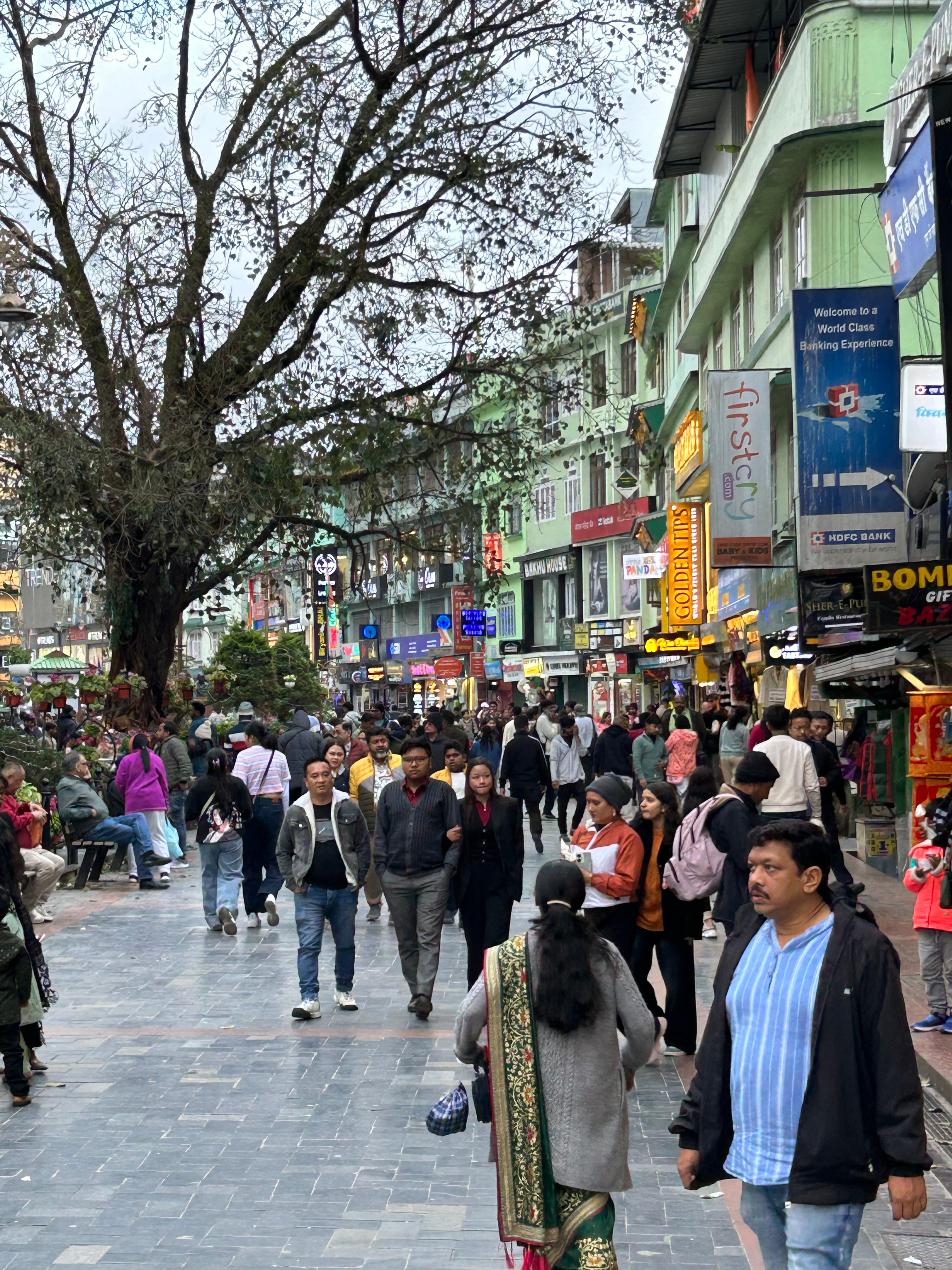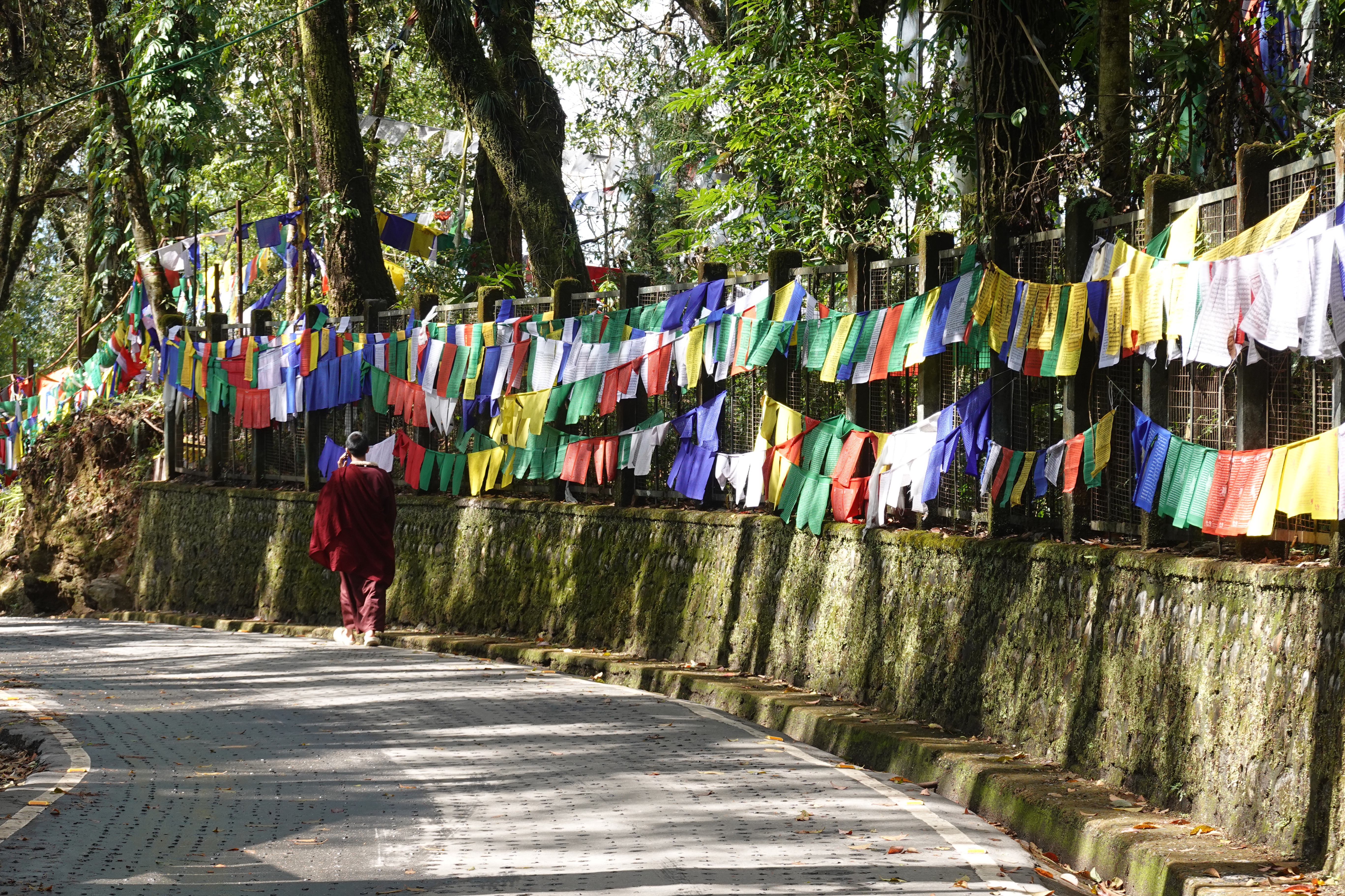 And then we hit Gangtok, which is a misdescription of our arrival, since it is another hill town with only one road in and one road out and more cars than seems possible, so that “hitting” Gangtok means snaking in a continuous stream of traffic for the last 6 or 7 kms, but it all still seems to avoid absolute intractable gridlock. What makes it pretty easy as a pedestrian is that Gangtok has some crazy innovations – a long and spacious pedestrian mall and, more amazingly, sidewalks. They are on the main couple of roads, protected by a decorated railing, and including a few overpasses to let you cross the main street without fear. Our Darjeeling guide is very impressed with this, which he says is reflective of Sikkim’s rule oriented approach to things, as he says that if a sidewalk was installed in Darjeeling it would instantly become a market, a clothes drying venue and a scooter parking lot – why waste that space on pedestrians when there is a perfectly good road to walk on?