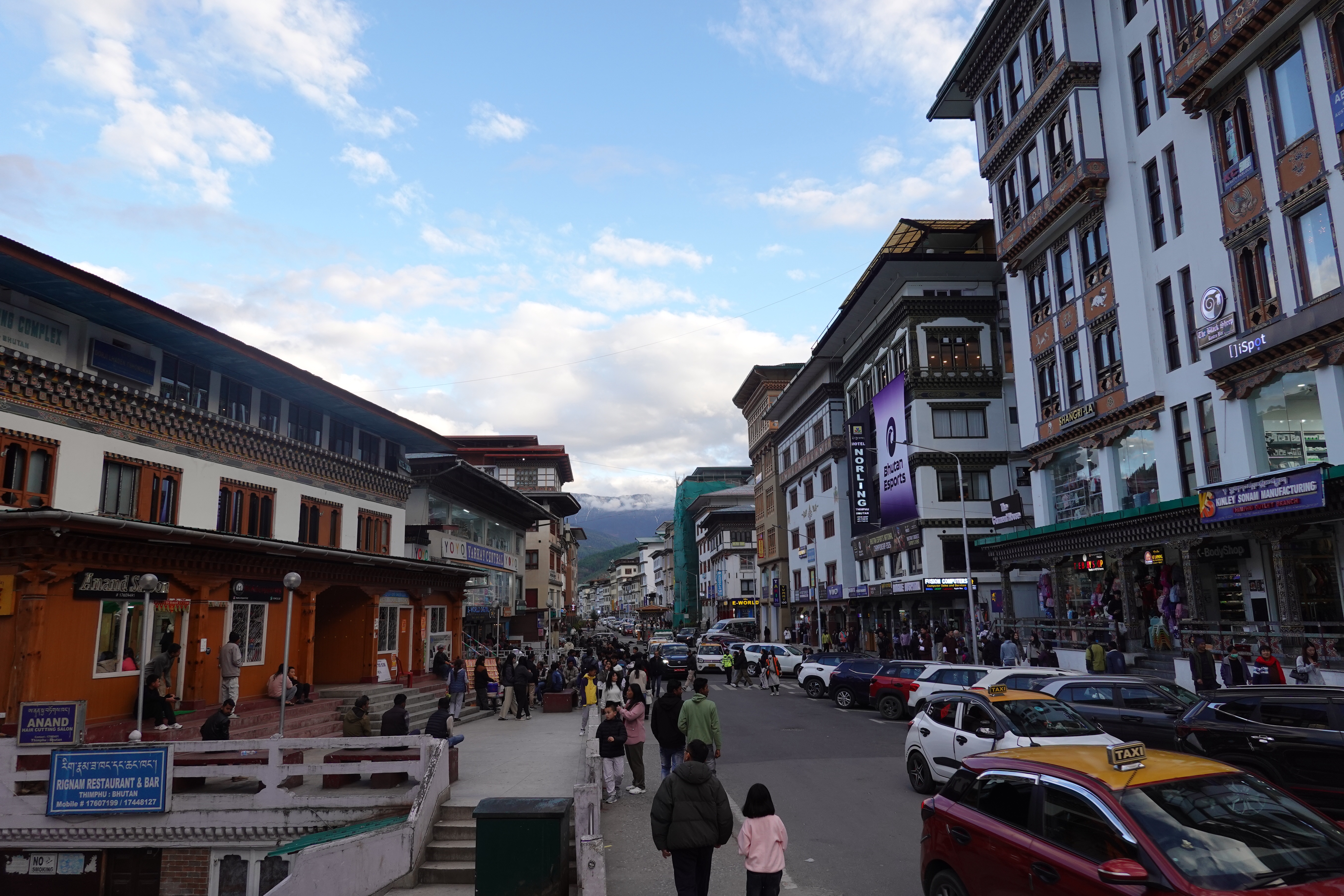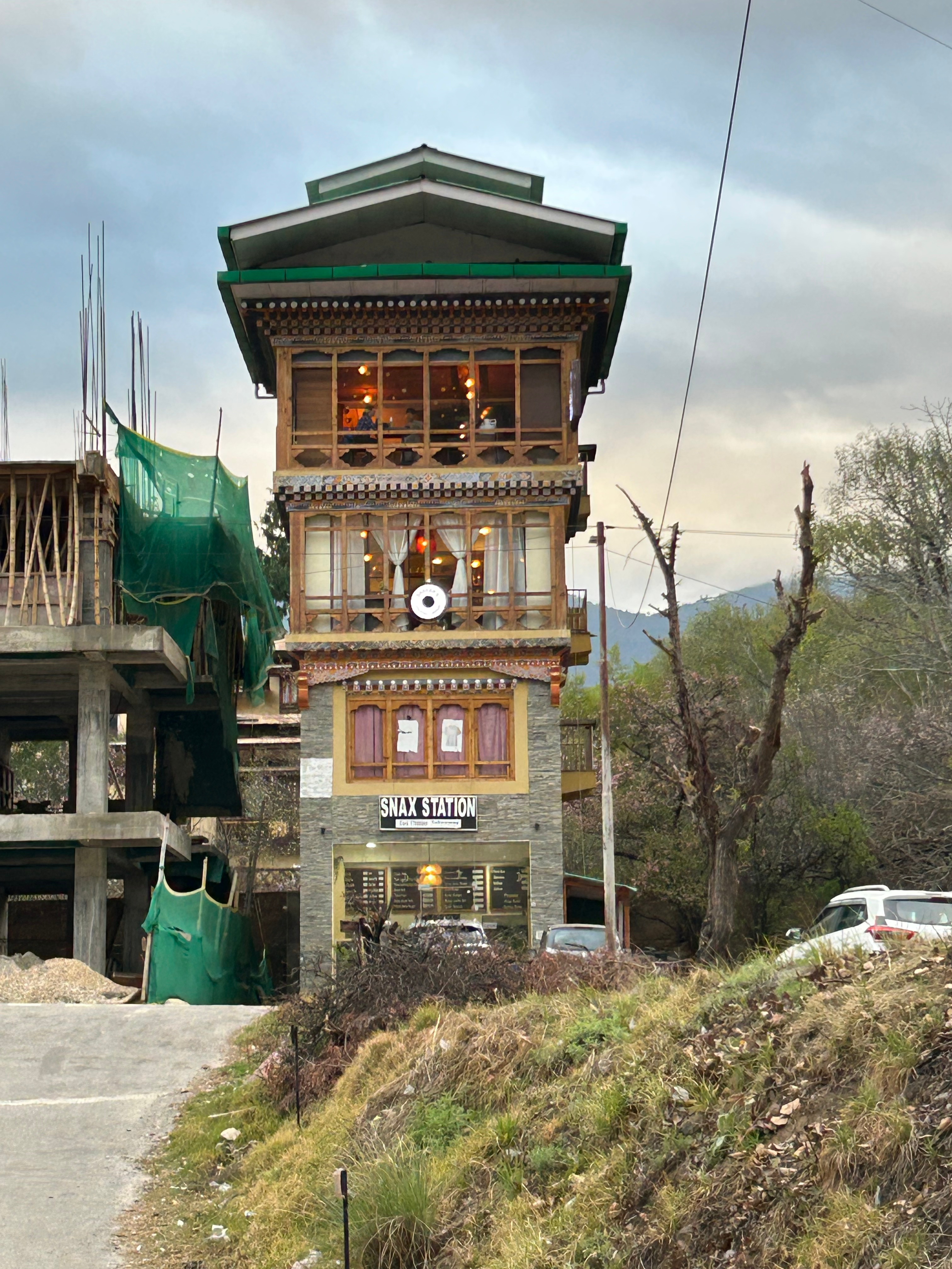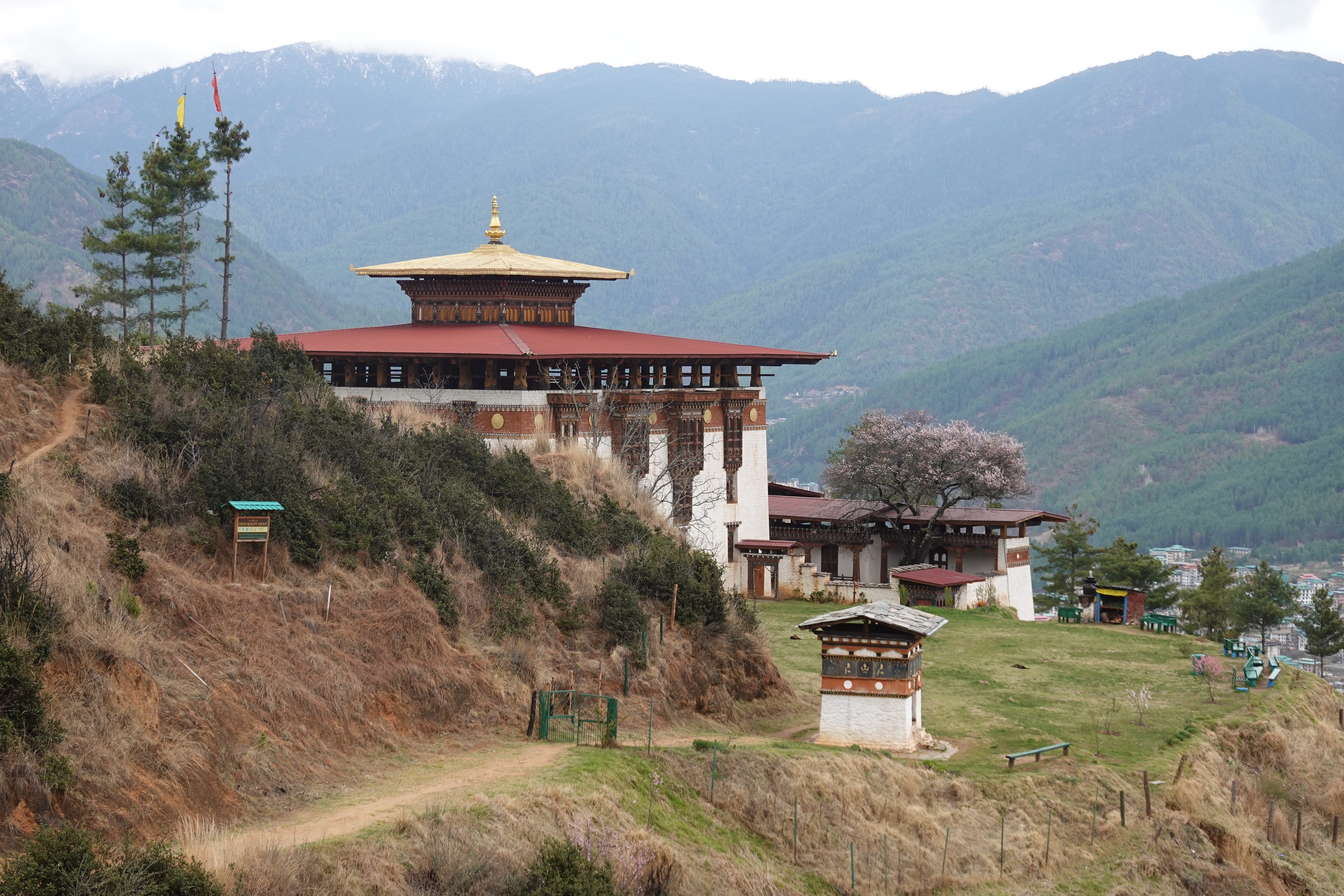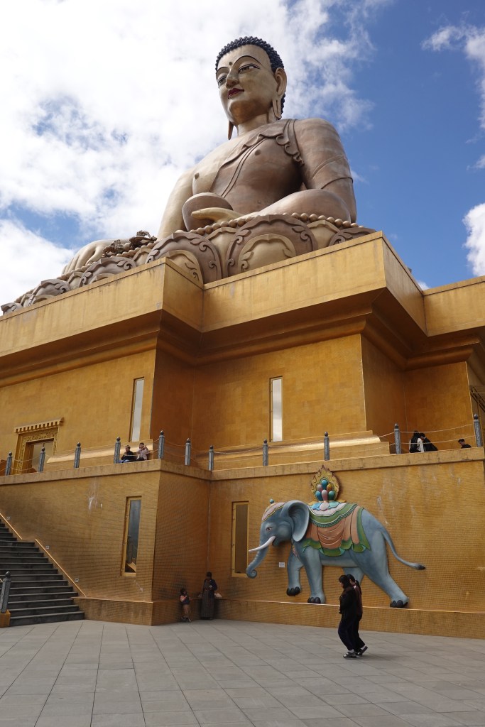 Well we crossed over from India into Bhutan the other day and it was a bit like the moment when Dorothy realizes she’s not in Kansas anymore. The map suggested some calm straight roads in India, up to the border town of Jaigaon, followed by some serious craziness to follow on Bhutan’s first highway and its only real land link to the rest of the world. But that told only part of the story. The road to Jaigaon was indeed flat and straight and well paved and blessed with the ultimate waste of Indian paint: lane markings. But at the outskirts of Jaigaon that all ended, and the main road through this busy but run down and beaten up trading town became something that looked and felt like someone had dug it all up, poured a lot of fresh concrete and then, before it dried, held a plowing match on it with water buffalo and followed up by using it for artillery practice before letting it set, after which it was covered in dirt to ensure dust when it was dry and mud when it rained. We pulled up to a lightly labelled building which was Indian immigration, as you need to check out, and went into a room with counters marked “Arrivals” and “Departures” but no one working as it was still before 10:00. Soon a lone clerk appeared, who went to work at the Arrivals counter and then, when that line was cleared, got up and walked two feet and sat down at Departures. Many stamps later we were out, though we then had to stand in the rain at a booth while a man in a uniform wrote down in longhand about a dozen categories of information about each of us into a large ledger that looked like a book of spells. Then we met our Bhutan guide and driver, and stumbled in the now pouring rain down an alley paved with broken cobbles and lined with shabby shops to a small door in the border wall where a Bhutanese man in a uniform wrote down all of the same information in longhand into his ledger. But then we were allowed to go through into a magical new world with an immigration hall using passport scanners and then we walked out on the other side of the building and we were in Bhutan. It was vertigo inducing: it wasn’t raining on this side of the border; the streets were wide and paved; the traffic was light and orderly; no one honked; there was absolutely no litter; and the shopfronts were tidy and glassed in and prosperous. We were dizzy.