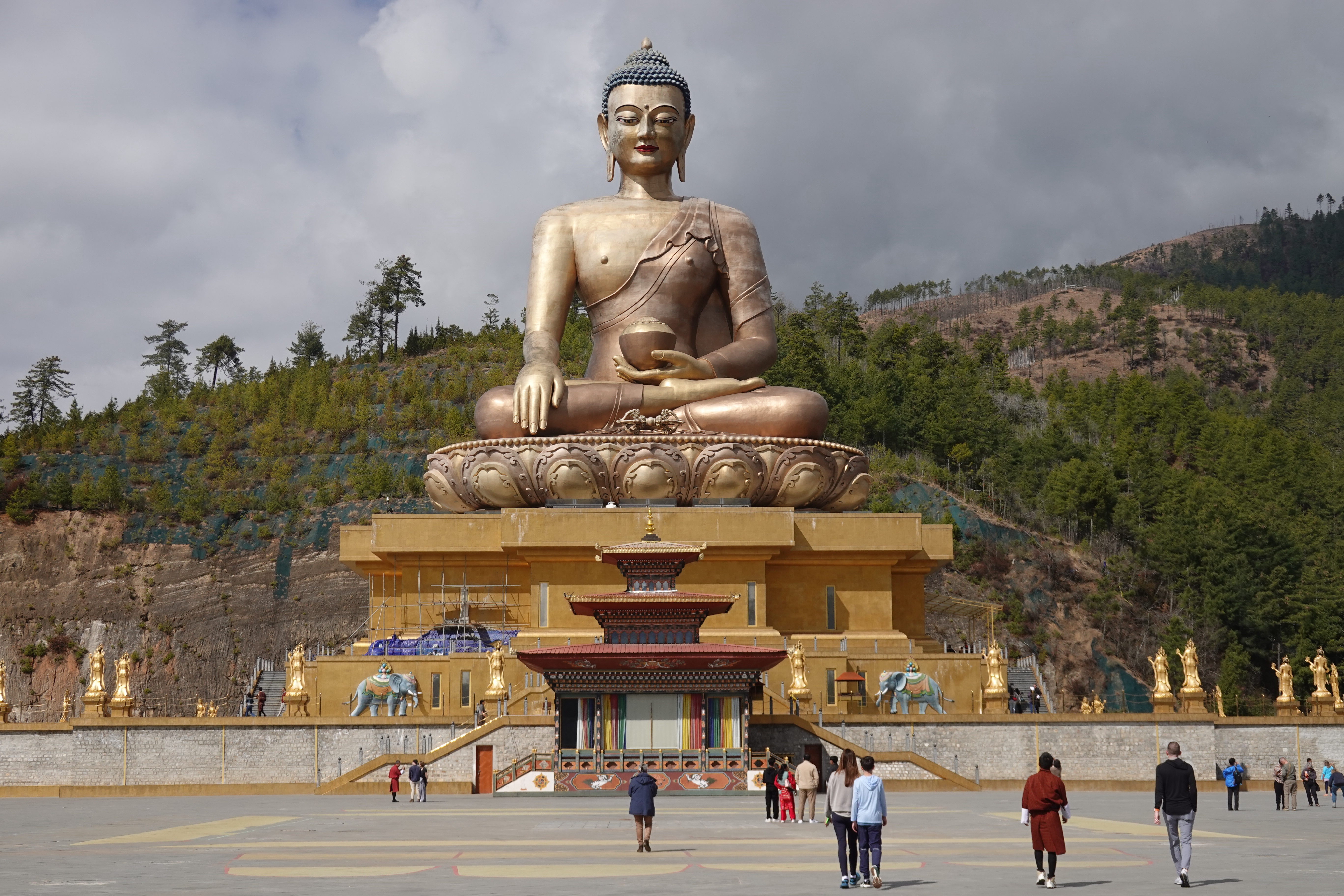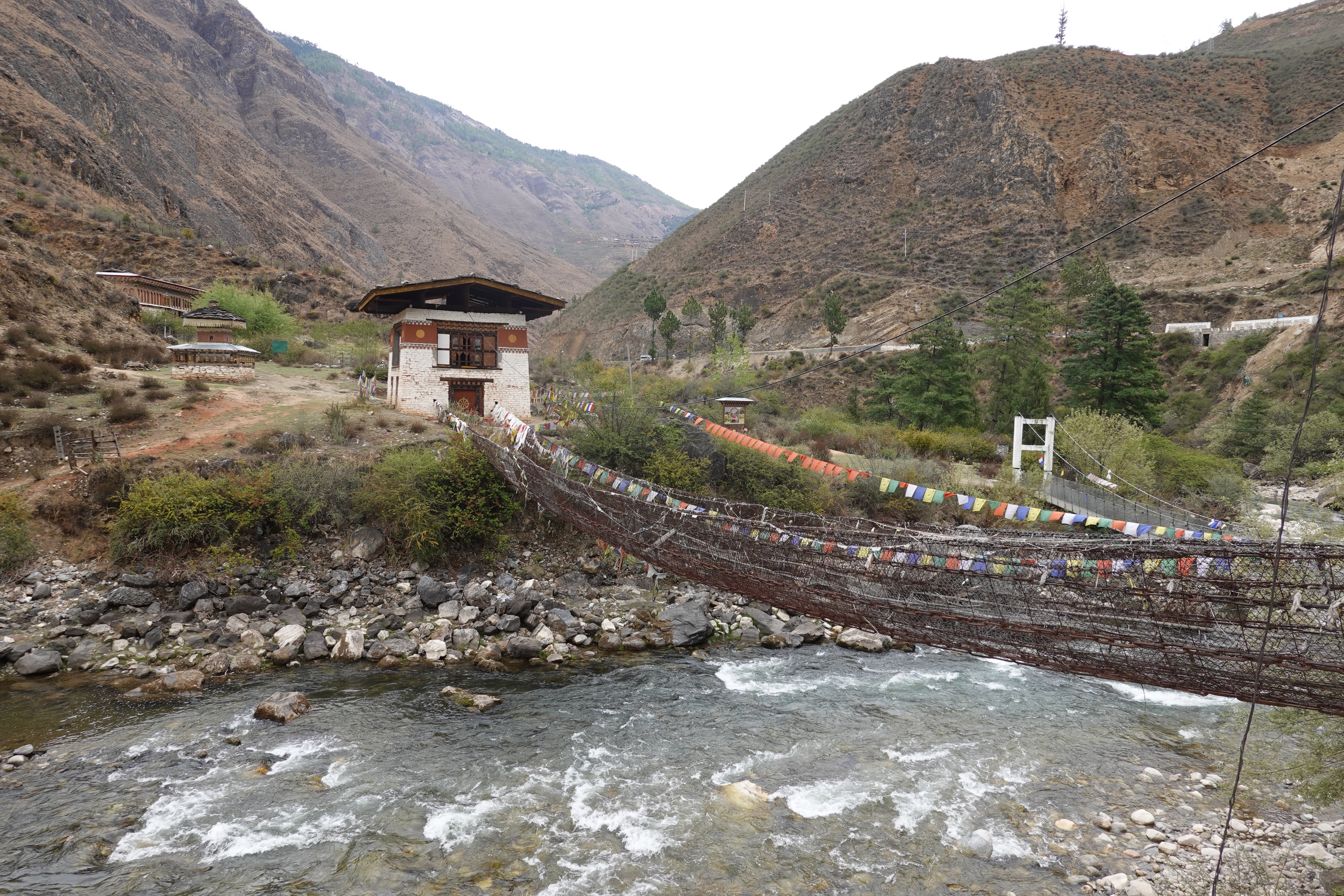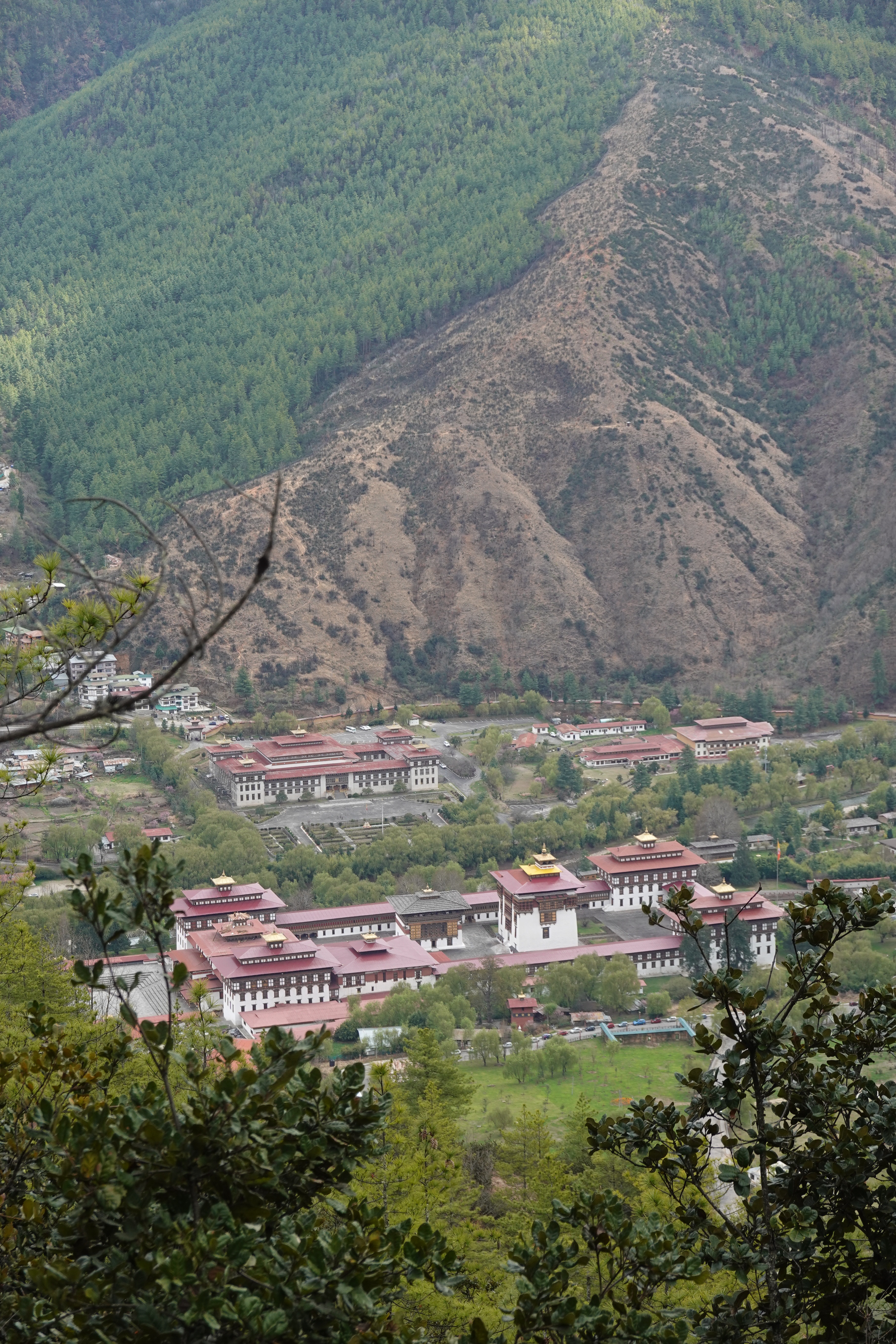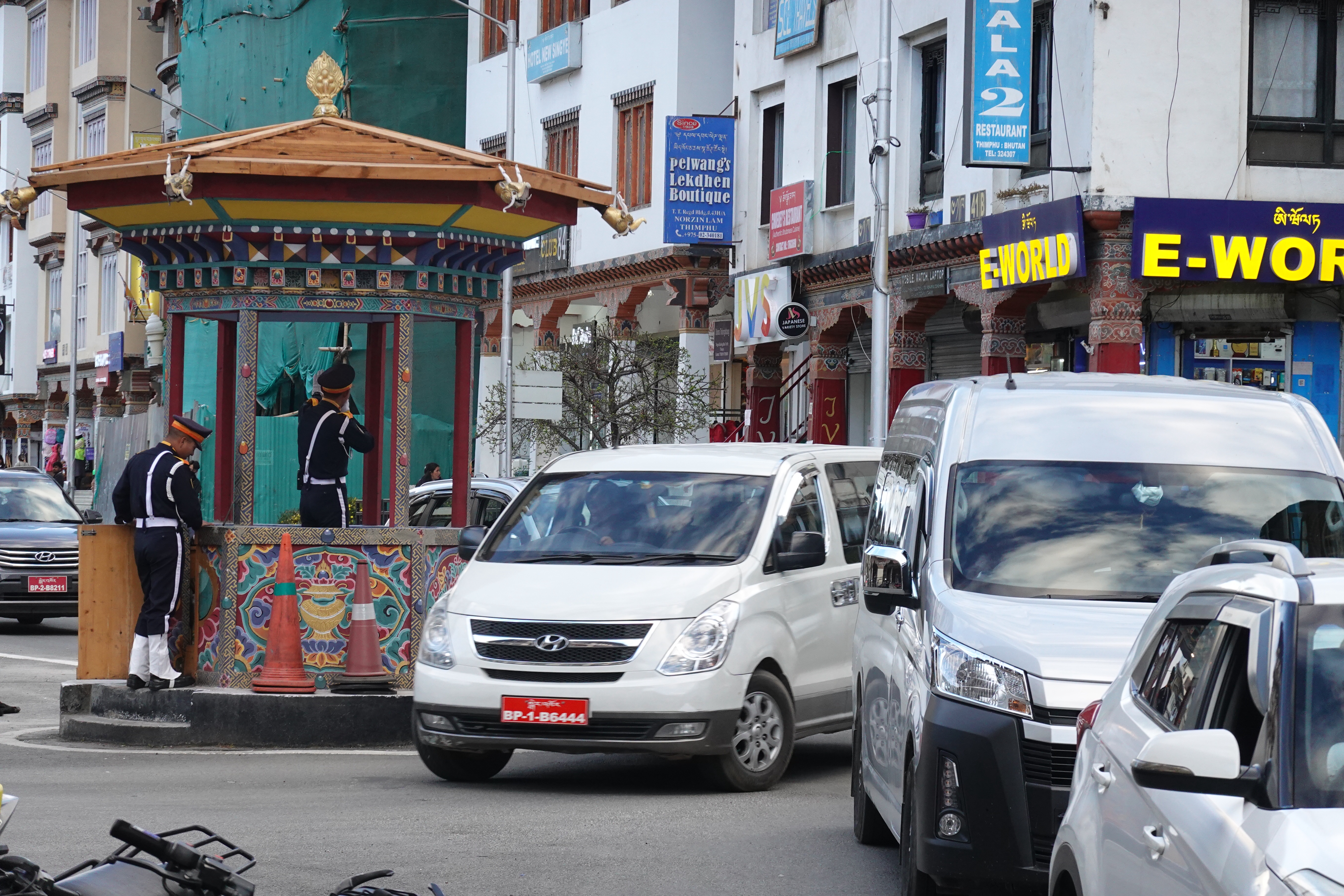Well we crossed over from India into Bhutan the other day and it was a bit like the moment when Dorothy realizes she’s not in Kansas anymore. The map suggested some calm straight roads in India, up to the border town of Jaigaon, followed by some serious craziness to follow on Bhutan’s first highway and its only real land link to the rest of the world. But that told only part of the story. The road to Jaigaon was indeed flat and straight and well paved and blessed with the ultimate waste of Indian paint: lane markings. But at the outskirts of Jaigaon that all ended, and the main road through this busy but run down and beaten up trading town became something that looked and felt like someone had dug it all up, poured a lot of fresh concrete and then, before it dried, held a plowing match on it with water buffalo and followed up by using it for artillery practice before letting it set, after which it was covered in dirt to ensure dust when it was dry and mud when it rained. We pulled up to a lightly labelled building which was Indian immigration, as you need to check out, and went into a room with counters marked “Arrivals” and “Departures” but no one working as it was still before 10:00. Soon a lone clerk appeared, who went to work at the Arrivals counter and then, when that line was cleared, got up and walked two feet and sat down at Departures. Many stamps later we were out, though we then had to stand in the rain at a booth while a man in a uniform wrote down in longhand about a dozen categories of information about each of us into a large ledger that looked like a book of spells. Then we met our Bhutan guide and driver, and stumbled in the now pouring rain down an alley paved with broken cobbles and lined with shabby shops to a small door in the border wall where a Bhutanese man in a uniform wrote down all of the same information in longhand into his ledger. But then we were allowed to go through into a magical new world with an immigration hall using passport scanners and then we walked out on the other side of the building and we were in Bhutan. It was vertigo inducing: it wasn’t raining on this side of the border; the streets were wide and paved; the traffic was light and orderly; no one honked; there was absolutely no litter; and the shopfronts were tidy and glassed in and prosperous. We were dizzy.