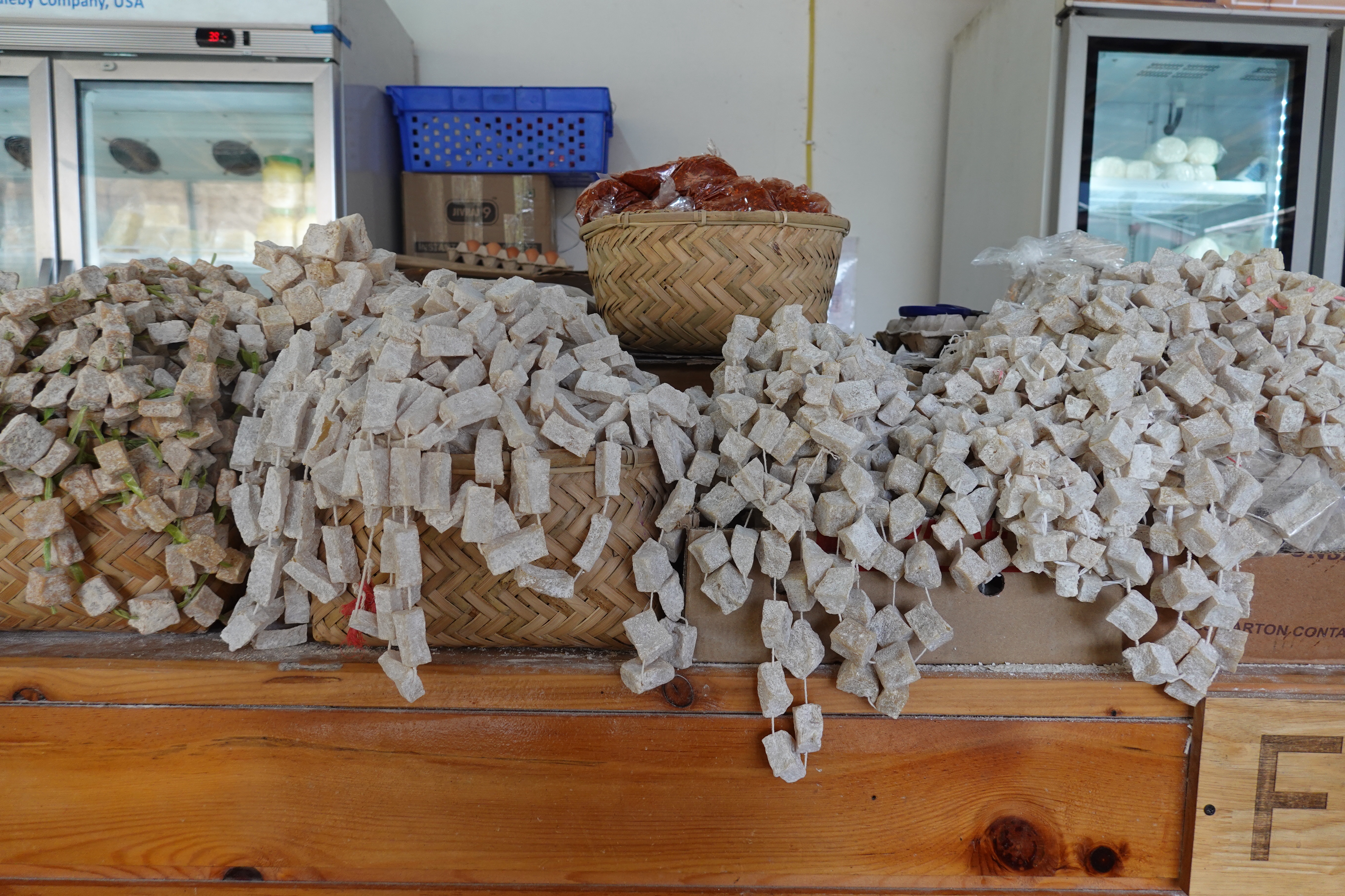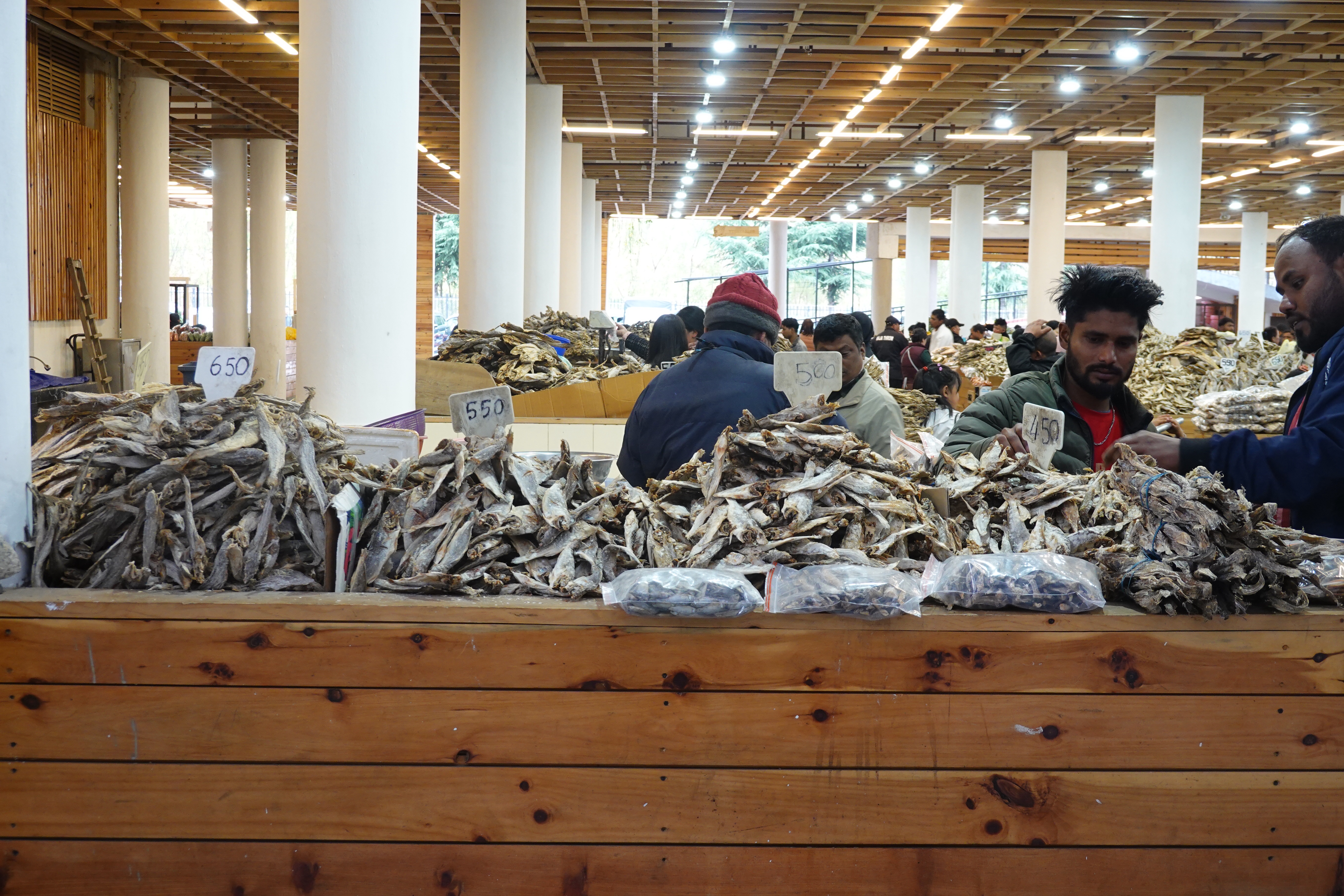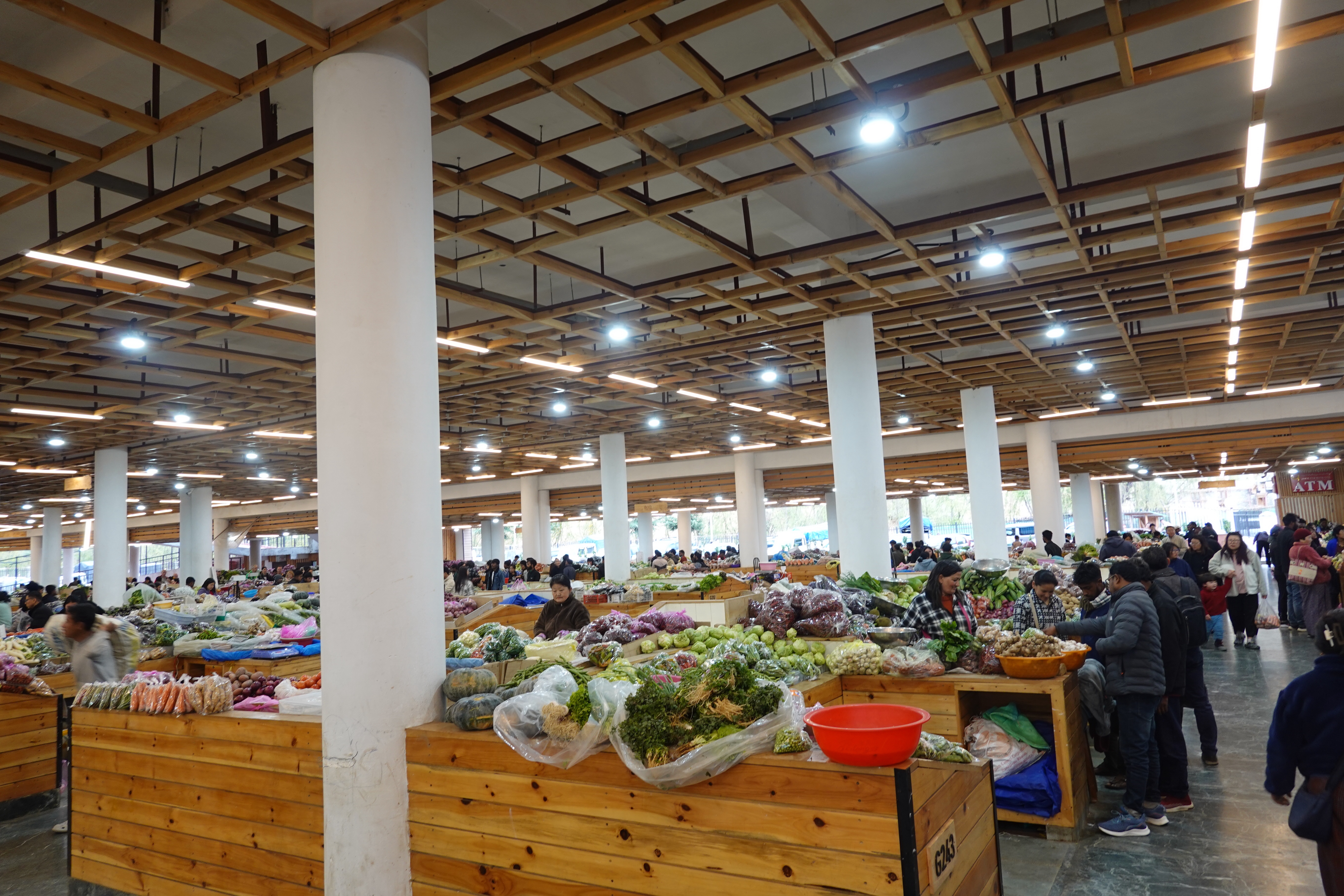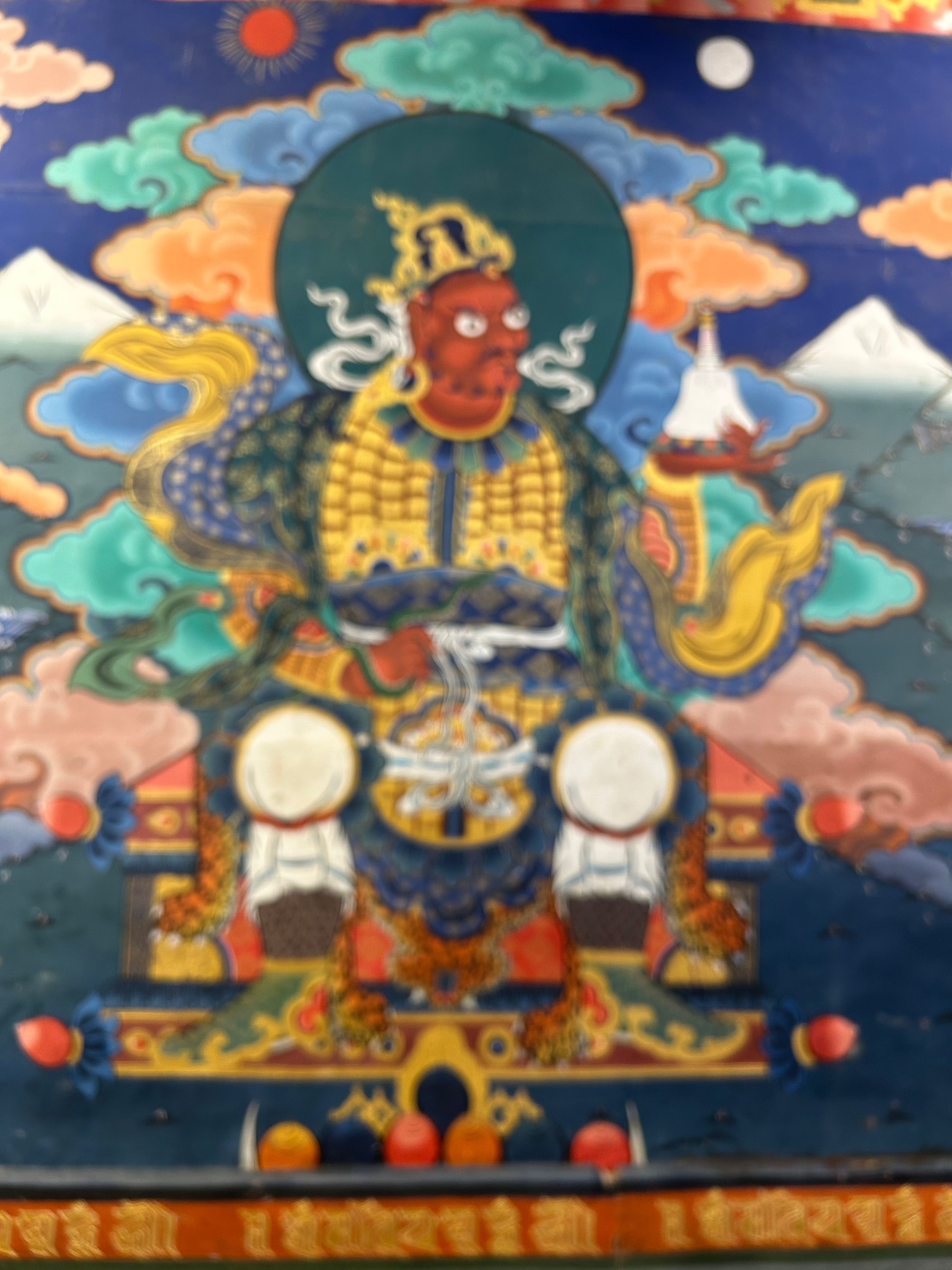 So we drove up about the curviest road ever built to Paro, at about 2250 m / 7400 ft, which was a bit of a change after starting the day at about 330 m. And then the next day, after the excitement of the Paro Festival, we were off to Thimphu (Tim-Pooh), the capital, at about 2350/7700. And we saw some cool things. Our guide, a fairly devout Buddhist, does not really distinguish between historical fact and religious myth when describing the doings of key figures of the past, so we saw the chain bridge built by a famous guru in the 17th century by making the iron links with his hands. We also went to an animal preserve and saw takins, one of the few large animals weirder looking than a moose, and the national animal of Bhutan, apparently not so much the product of evolution as the result of the Mad Guru taking the skeletons of a cow and a goat and putting the head of the latter on the body of the former to impress the villagers. We saw the vegetable market, too clean and well organized to be believable, and where we tried to squeeze the rock hard dried cheese cubes, one of which our guide popped in her cheek like a chew and which was still there when we left her two hours later. And we had a Red Panda craft beer at the cozy Drunken Yeti on the top floor of Thimphu’s narrowest building, accessed by the fire escape at the back.
