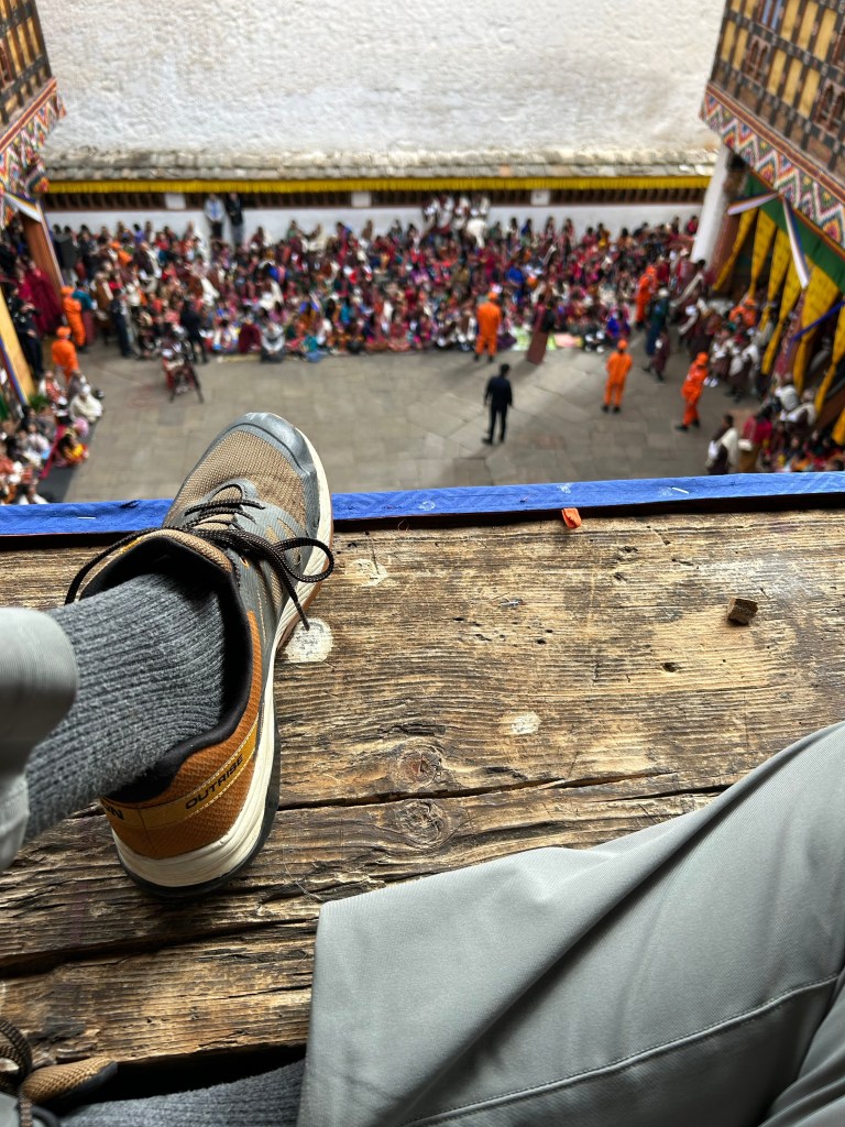 PS – My cousin Molly asked nicely for visual proof of my exact circumstances while perched on a ledge overlooking the Paro Festival, as reported earlier. See the last picture below.
